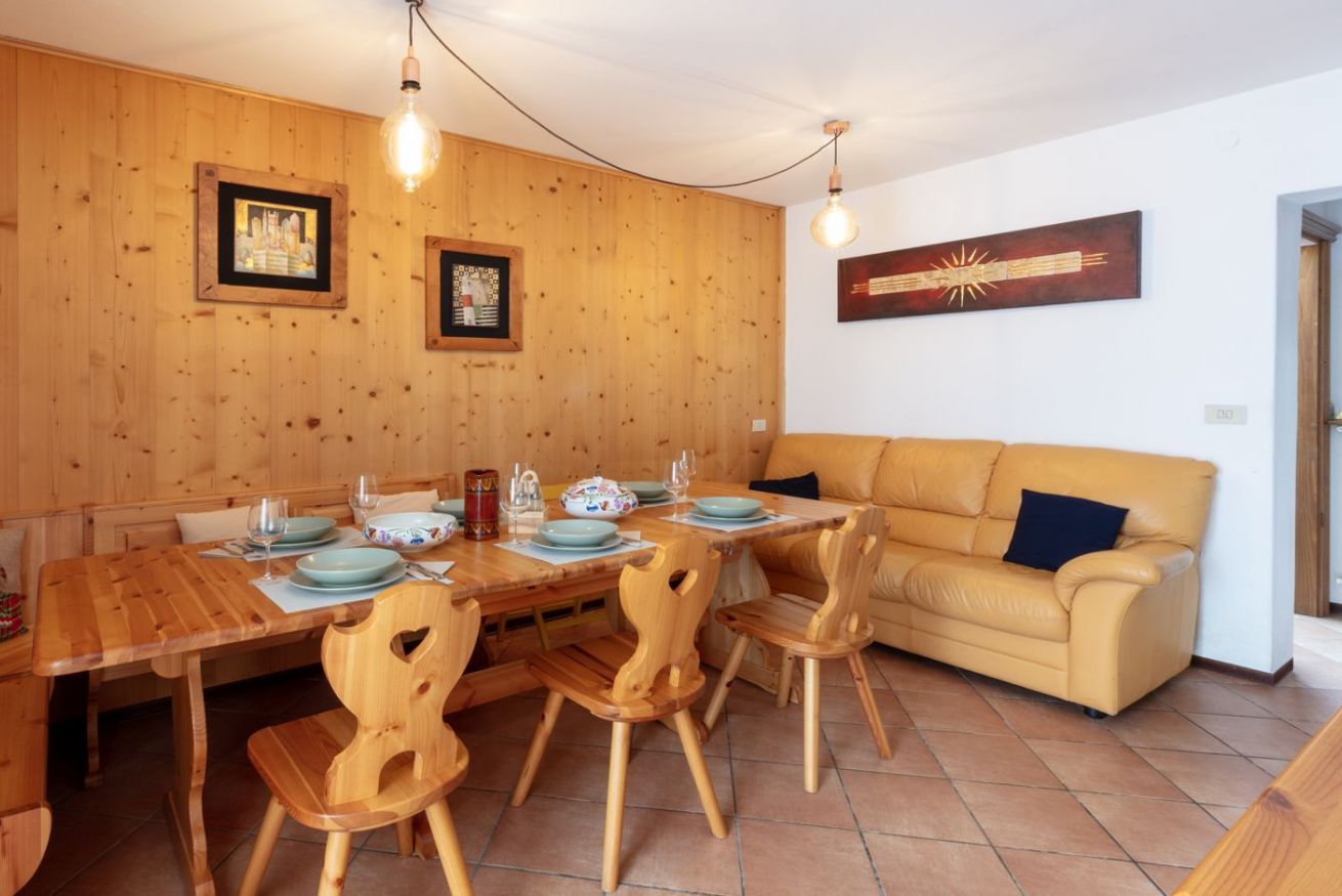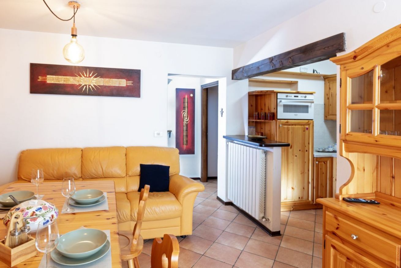 La zona giorno accoglie gli ospiti con un soggiorno confortevole e una cucina perfettamente attrezzata, pensata per chi ama condividere momenti conviviali dopo una giornata all’aria aperta. Dal balcone si può respirare l’aria fresca di montagna e godere della quiete del paese, mentre un pratico bagno di servizio completa questa area della casa.